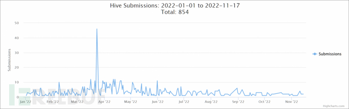虽然向ID勒索软件平台提交的信息并不包括所有的Hive勒索软件攻击,但自今年年初以来,受害者已经提交了850多个样本,其中许多是在3月底和4月中旬之间的巨大活动高峰后推送的。